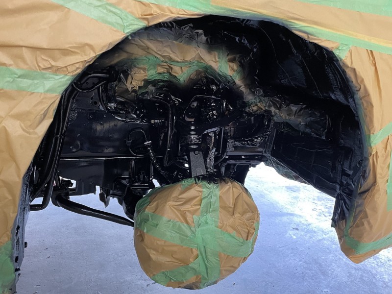 トヨタ ハイエース 下回り防錆塗装 養生完了 フロント側タイヤハウス