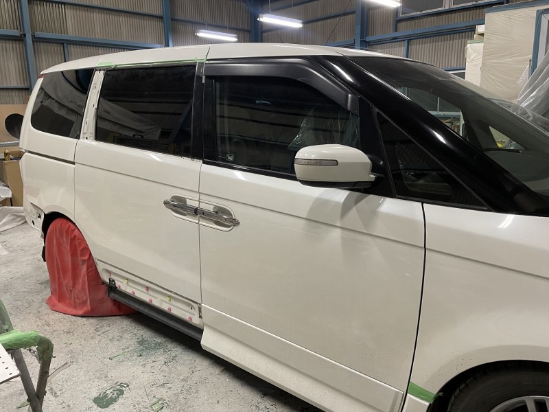 ホンダ エリシオン クォーター、スライドドアの塗装後の仕上げ完了(フロント側から)