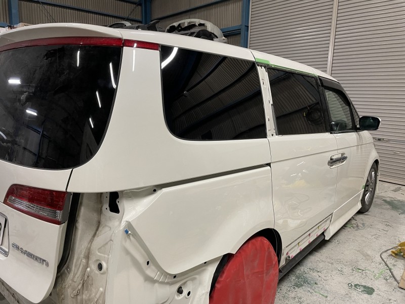 ホンダ エリシオン クォーター、スライドドアの塗装後の仕上げ完了(リヤ側から)