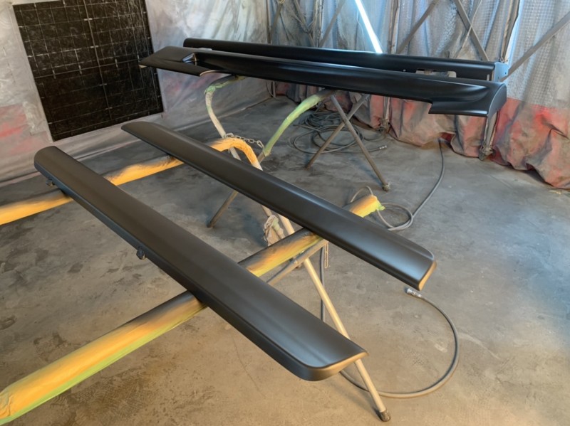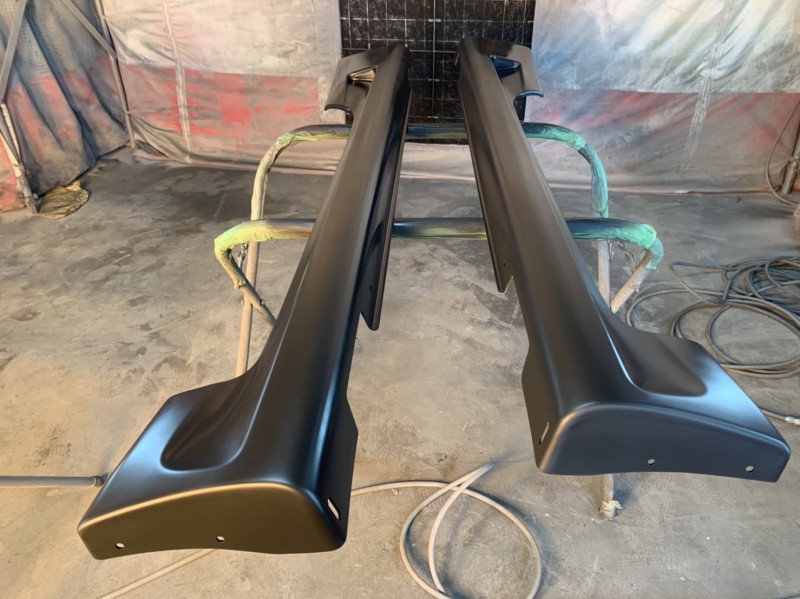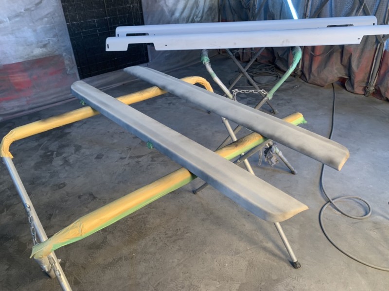 昨日はR33 スカイラインの各パネルの下地処理準備が完了したので、サイドスカート、ドアパネルモールディング、フロントバンパー、リヤバンパー、フロントスポイラー、ルーフスポイラー、給油口パネルの下地処理(サフェーサー処理)をしました。(^○^)