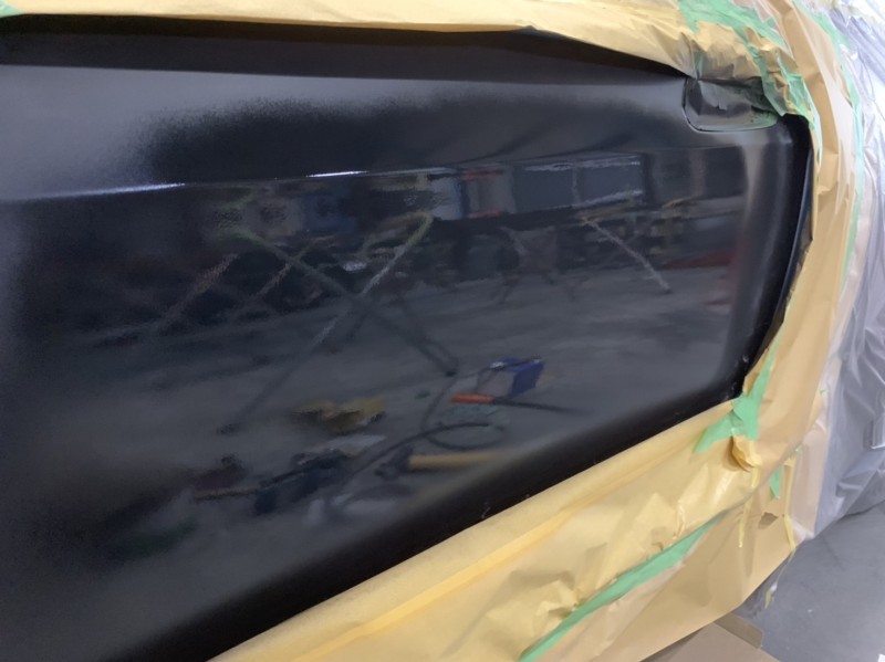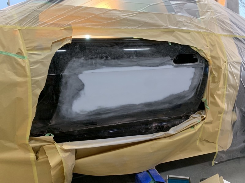 R33 スカイライン 左ドア 凹み 板金後の下地処理(サフェーサー)完了