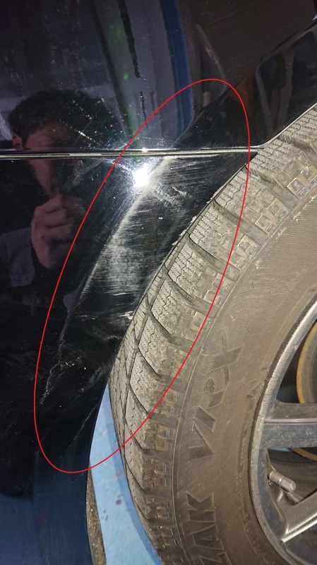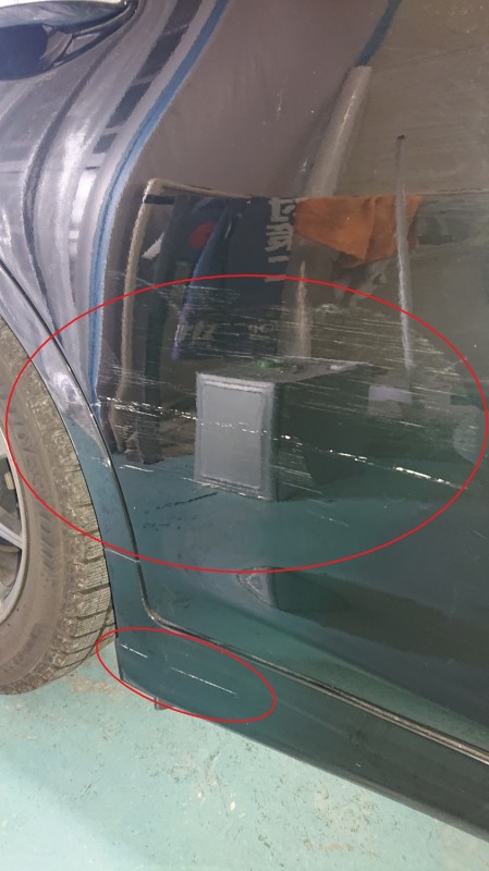 右リアドア、サイドスカート、クォーターパネルがキズついてますね。