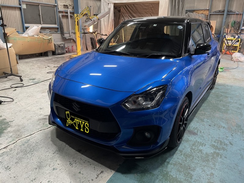 スズキ スイフトスポーツのフロントアンダーフラップ、サイドアンダーフラップ、リヤアンダースポイラー、リヤゲートスポイラー、アイラインの各部品取付とフロントエンブレム(Sマーク) メッキからマッド色のエンブレムに変更、リヤエンブレム(Sマーク)外しが完了しましたので投稿致します。(^_^)/