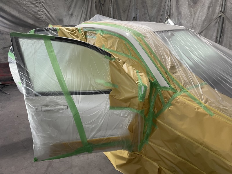 先日鈑金が完了したミツビシ ランエボの塗装準備(養生)が完了したので投稿致します。(*^_^*)
