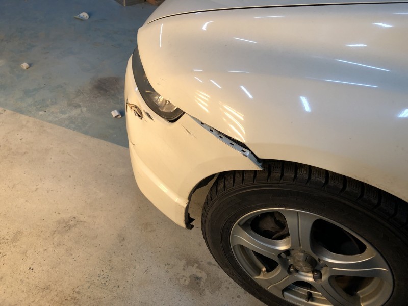 バンパー破損、フェンダー変形、ヘットライトのステー破損でオーナー様の要望で中古部品にて対応します。
