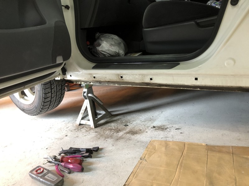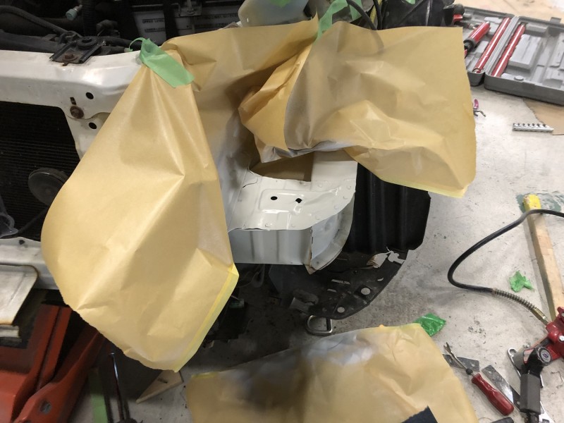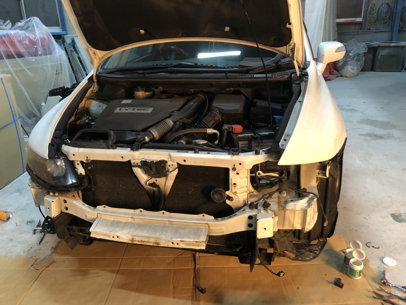 フェンダーを外し、ラジエターサポート&サイドメンバーを調整して板金、溶接していきます。