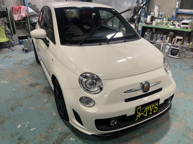 昨日塗装したFIAT アバルトのフロントバンパーの仕上げが完了して車体に取付まで完了しました。