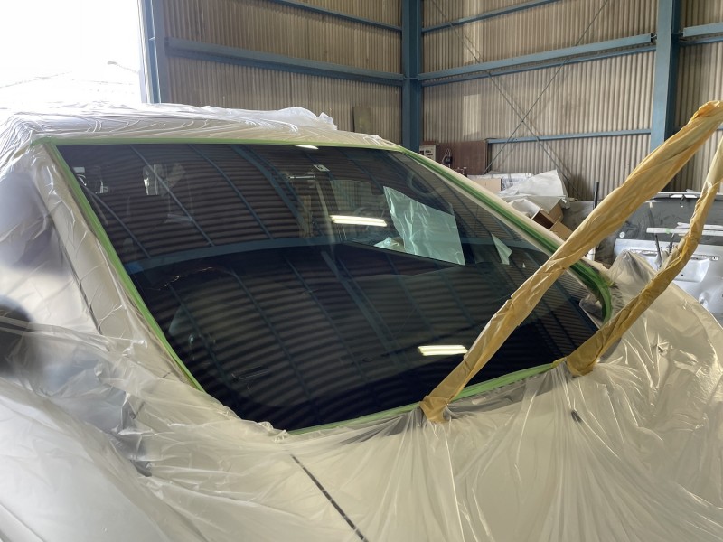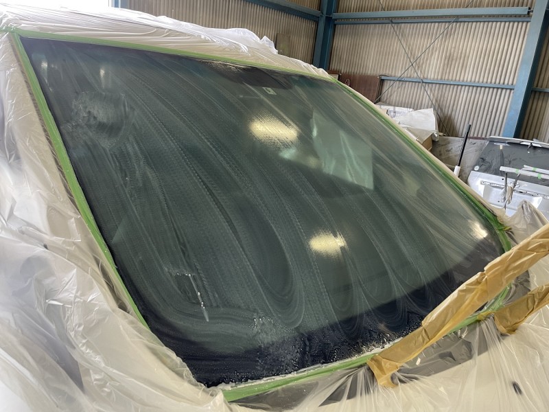 写真は撥水コーティング前の油膜除去剤を拭き取ったところです。