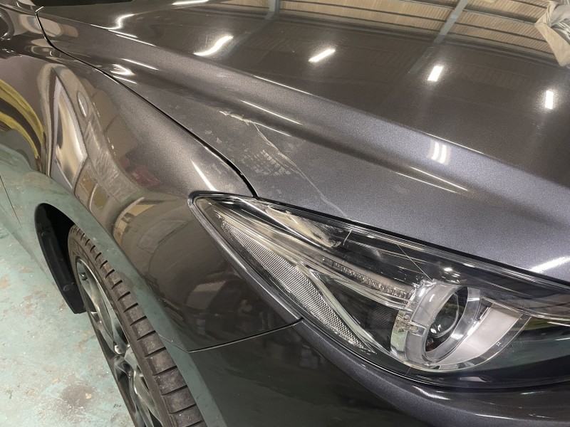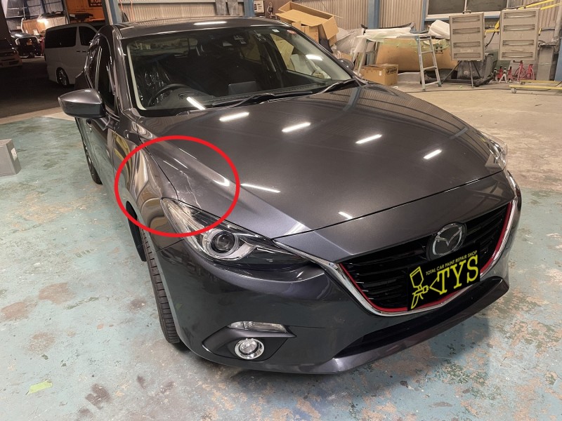 マツダ アクセラのボンネット、フェンダー、ヘッドライトの修理ということで依頼をいただきました。(^_^)/