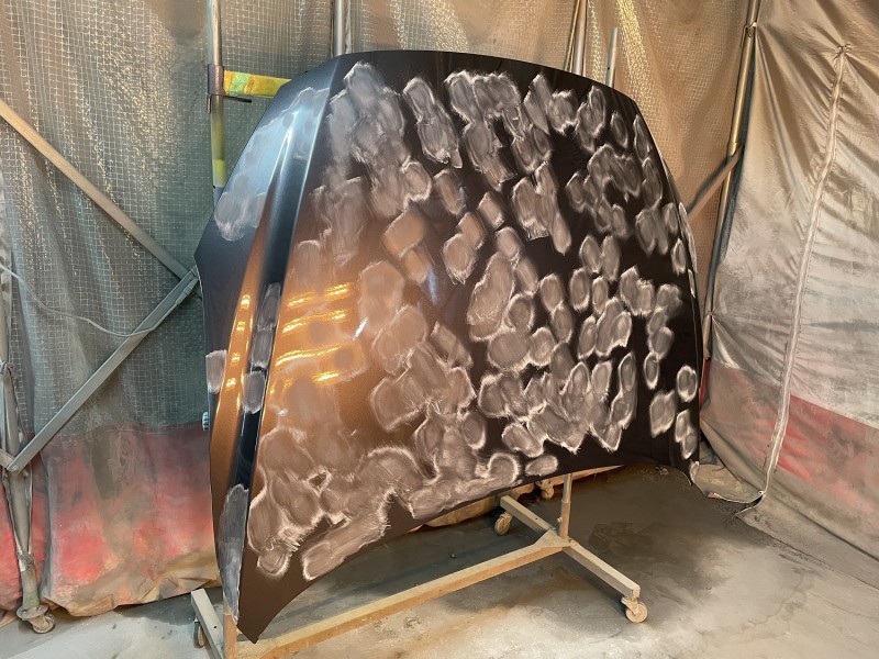 マツダ アクセラ ボンネット 塗装後のゴミ除去中