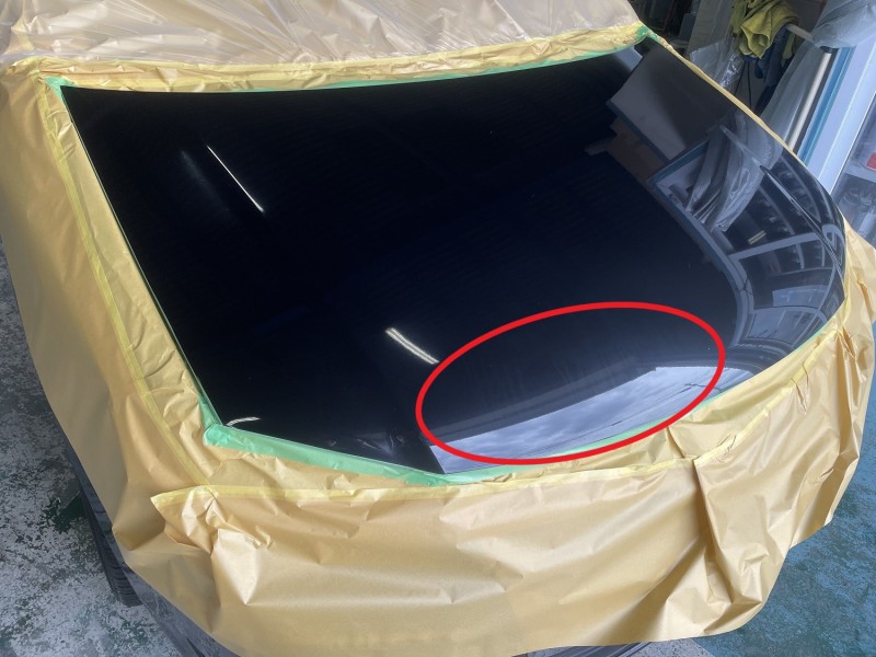 大きく目立つのは赤丸内の水垢ですが、ボンネット全体にスケール(水垢)を確認しましたのでボンネットパネル1枚全部磨きました。(*^O^*)