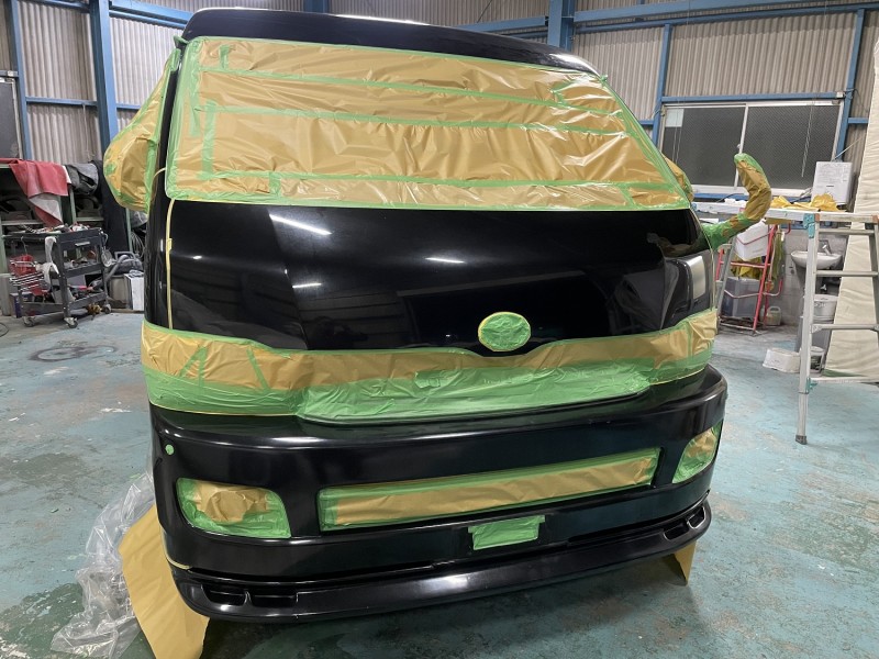 トヨタ ハイエース ボディ磨き 養生完了(フロント)