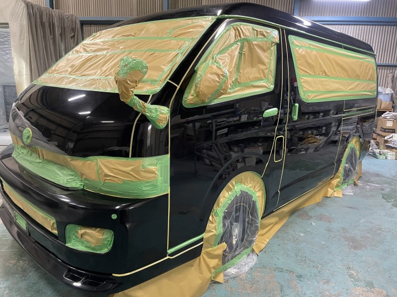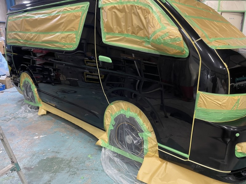 トヨタ ハイエース ボディ磨き 養生完了(右側面)
