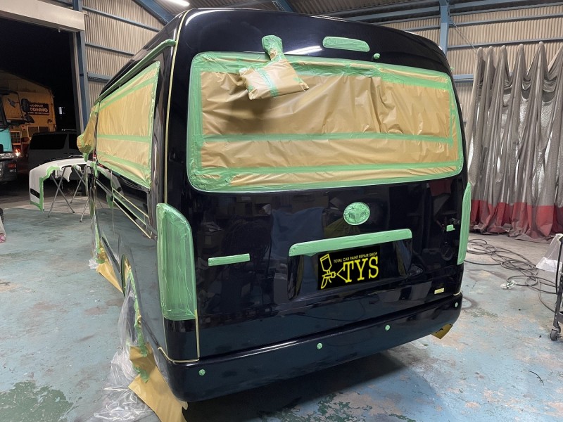 トヨタ ハイエース ボディ磨き 養生完了(リヤ)