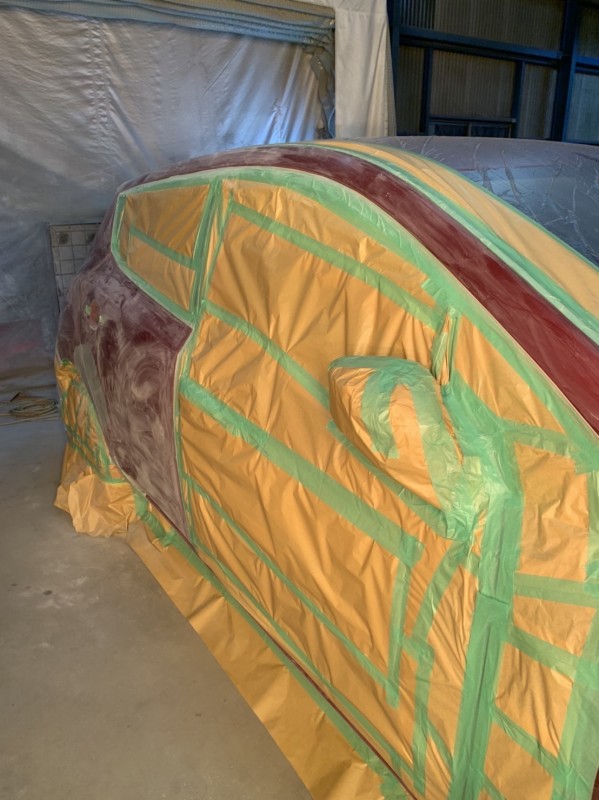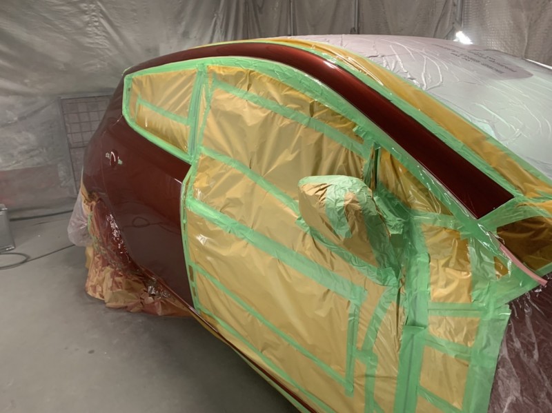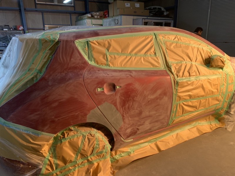 ニッサン リーフ 右リヤドア、右クォーターパネル 養生完了、塗装準備中(リヤから)