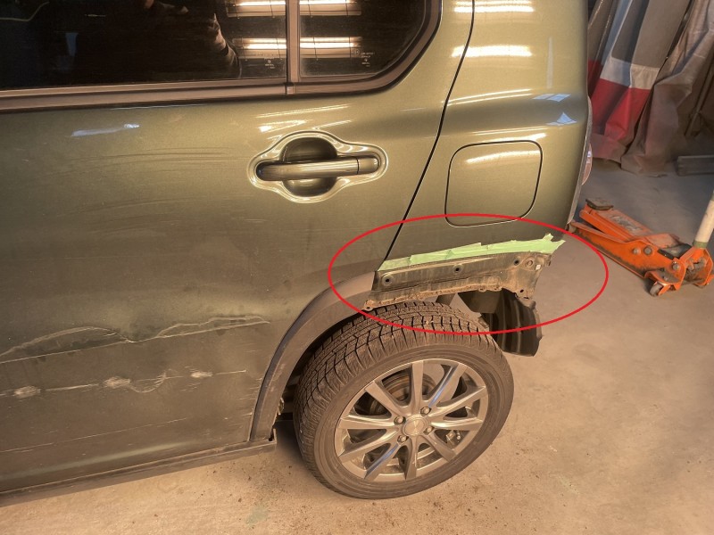 スズキ ハスラーのフロントドア、リヤドアの中古部品のめどがついたので新品交換するリヤフェンダーガードを外す為、リヤバンパーを外しました。( ^o^)ノ