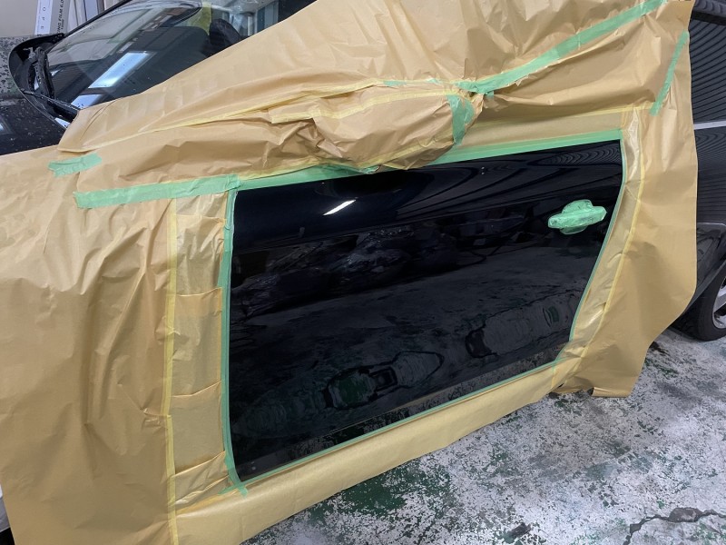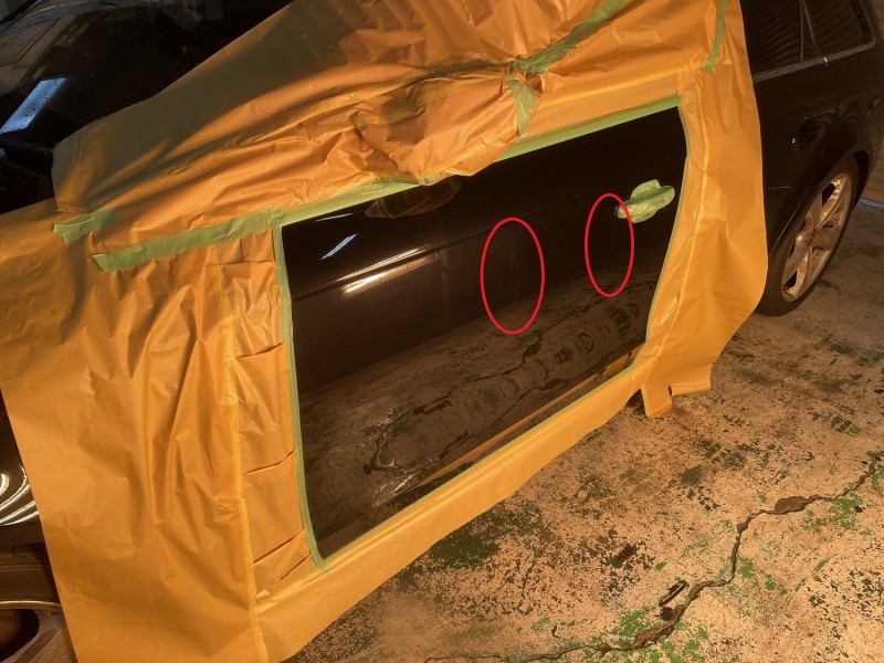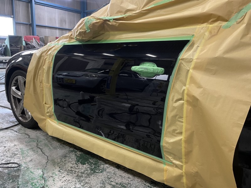 以前フロントバンパー修理で修理いただいたアウディ A4アバントのお客様が駐車場で隣の車にドアをぶつけられたということで入庫いただきましたので投稿致します。