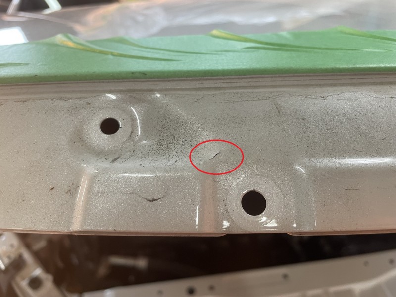 衝撃により鉄板が引っ張られて、塗装が割れてます。
