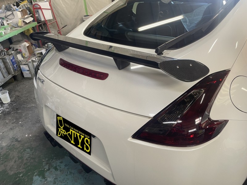 ニッサン フェアレディZがリヤバンパー修理&トランクスポイラーの仕様変更&リヤディフューザー加工ということで入庫しました。