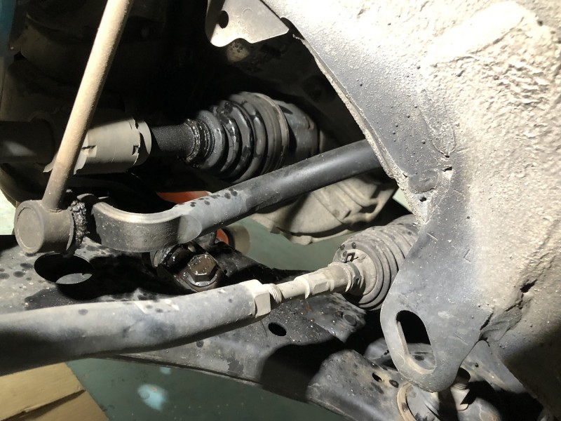 ジャッキアップしてタイヤを外し覗いてみると、ドライブシャフトブーツがお亡くなりになってました。チーン(T_T)