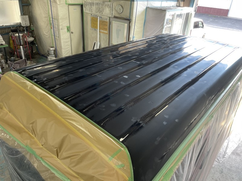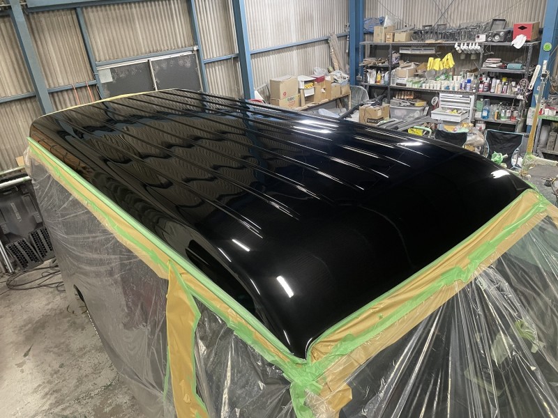 トヨタ ハイエース ルーフ部 塗装後のブツ取り (リヤから)