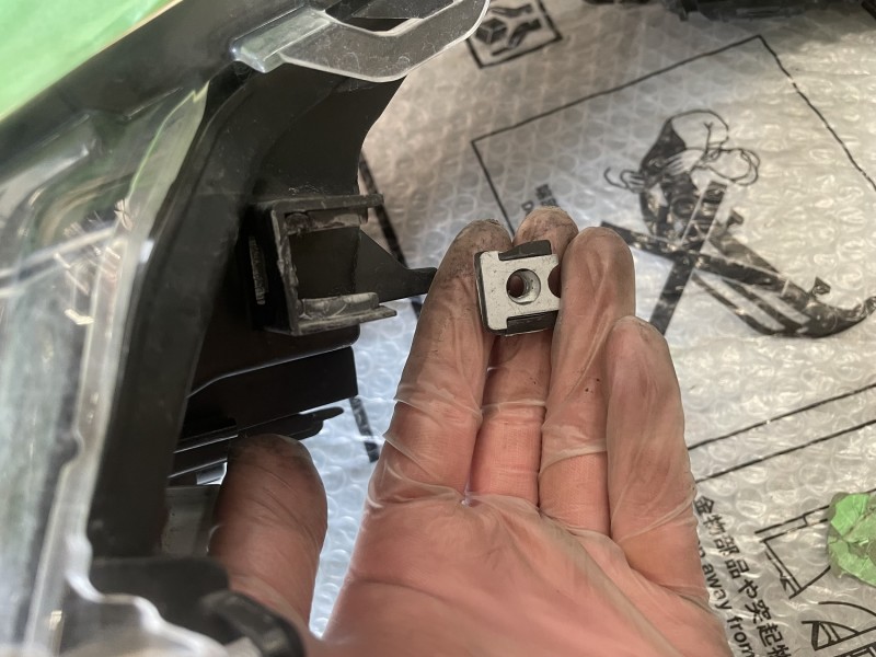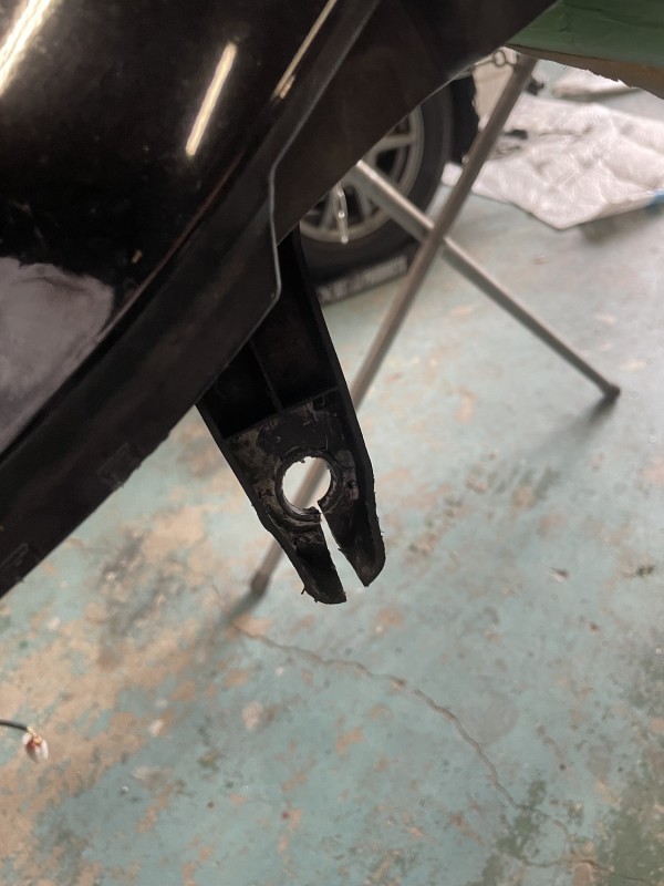 フロントフェンダーを外してみたところ、フロントフェンダー内のブラケットも押されて変形してました。