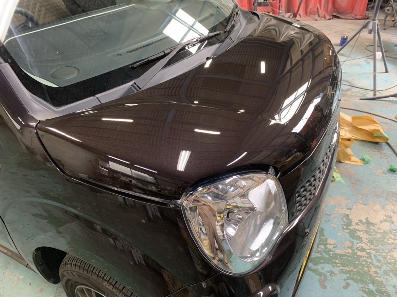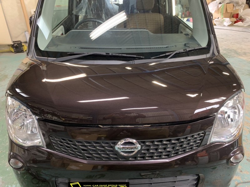 ニッサン モコ ボンネット修理 塗装後の仕上げ完了