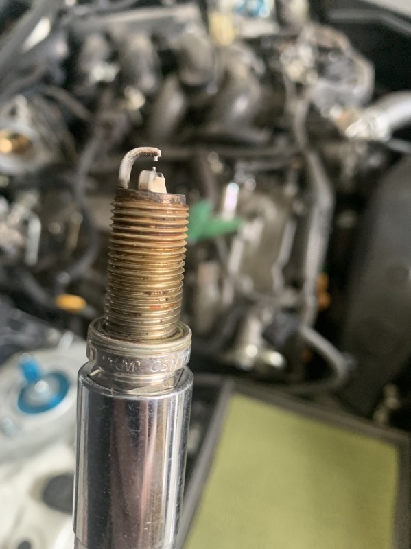 中古車でプラグ交換をした履歴がない&オーナー様も交換してないということでプラグを確認したら、全体的に白っぽく燃えかすが焼き付いていました。