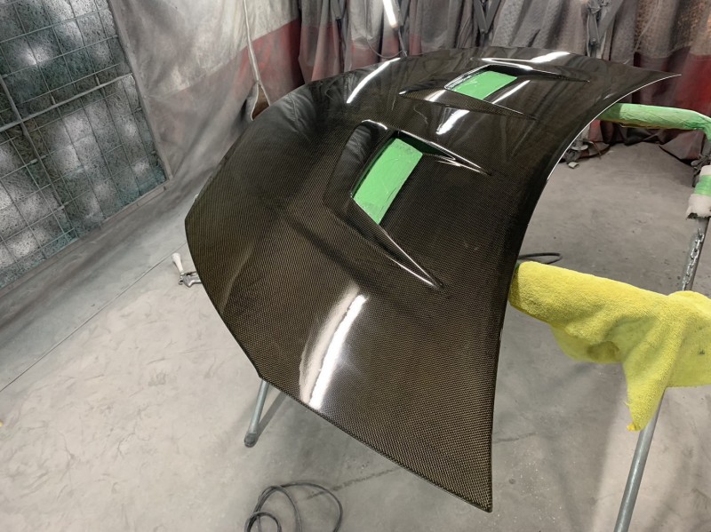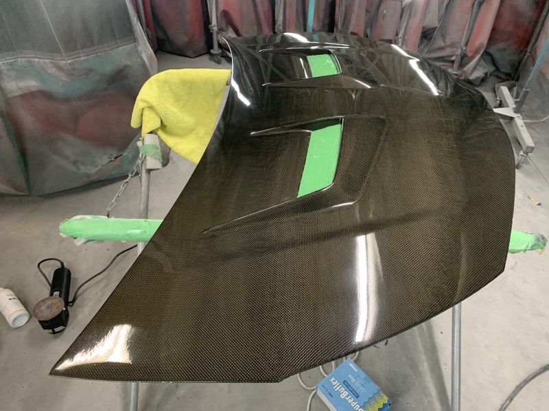 ヴィッツRS 中古カーボンボンネット クリヤー塗装完了(右側から)