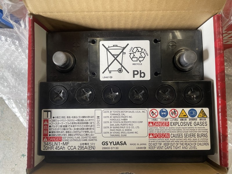純正で実装されていたバッテリーはGS_YUASA製の345LN1という代物で今回は同メーカーの性能ランクアップの355LN1のバッテリーを用意しました。