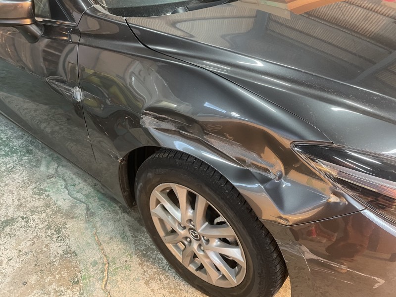 マツダ アクセラ 事故側面修理 フロントフェンダーからフロントドアにかけて破損