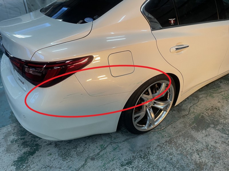 リヤバンパーからリヤクォーターにかけてぶつかった形跡がありました。