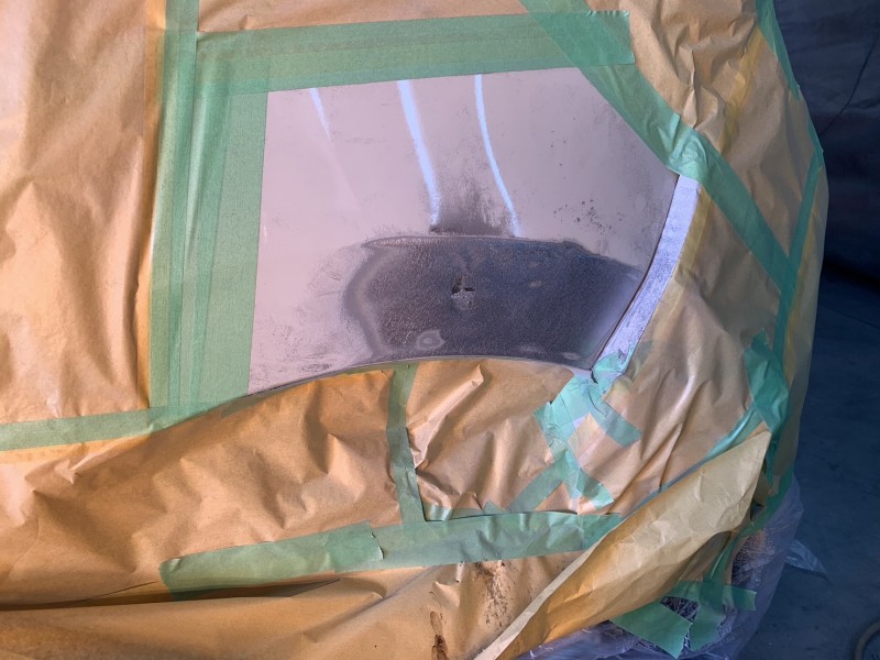 スズキ アルト 左クォーターパネル凹み修理 損傷部分 サンディング&鈑金中