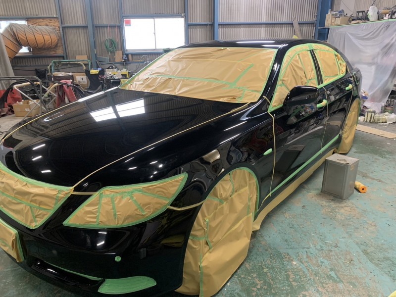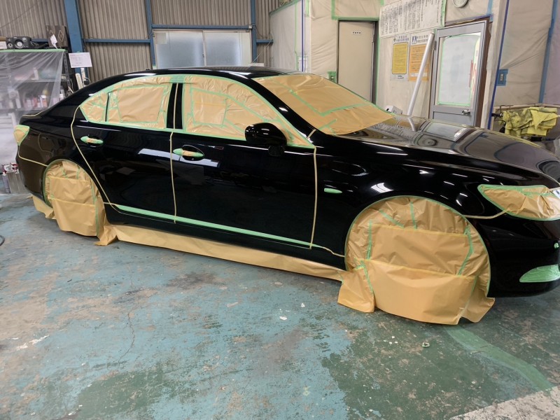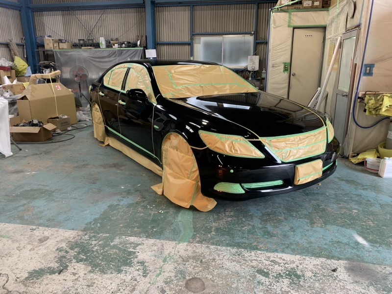 レクサス LS460 ボディ磨き 養生 完了(フロント側から)
