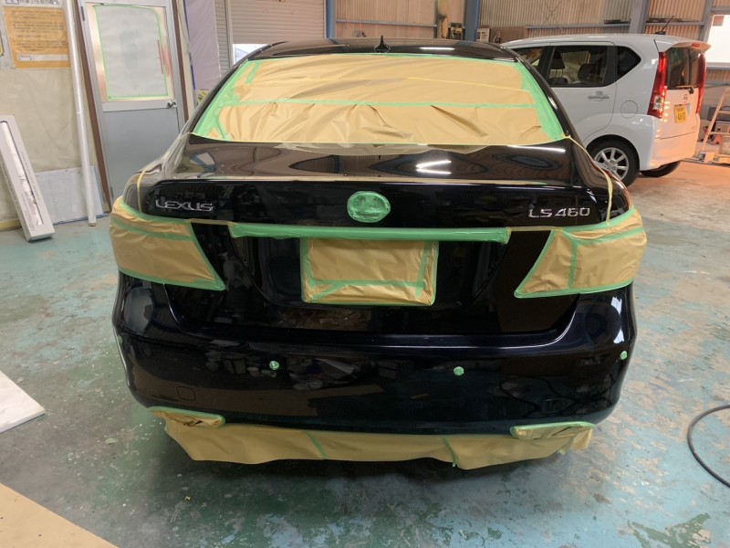 レクサス LS460 ボディ磨き 養生 完了(リヤ側から)