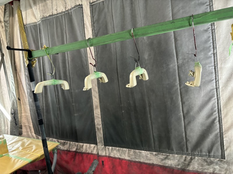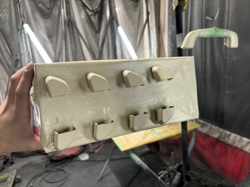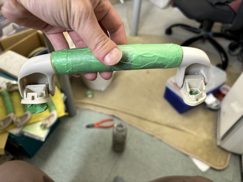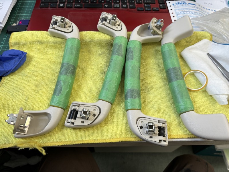 トヨタ 210クラウンにレクサス LS600Hのアシストグリップを取付けることができるらしく、オーナー様はLS600Hのアシストグリップを入手したがトリムカラーが相違しているらしく全然クラウンの内装色と合わないということでクラウンの内装色で塗装して欲しいとのことでした。