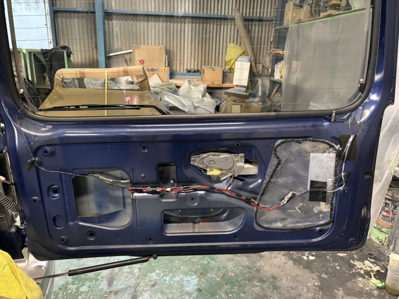 テールランプのブレーキから電源を拝借してリヤゲートに繋がってる蛇腹ゴムを通して・・・と考えながらリヤゲートの内張を剥がしてたら、なんとリヤゲート内のハーネスにテールランプのブレーキ配線と同じ配色の配線があるではありませんか。(笑)