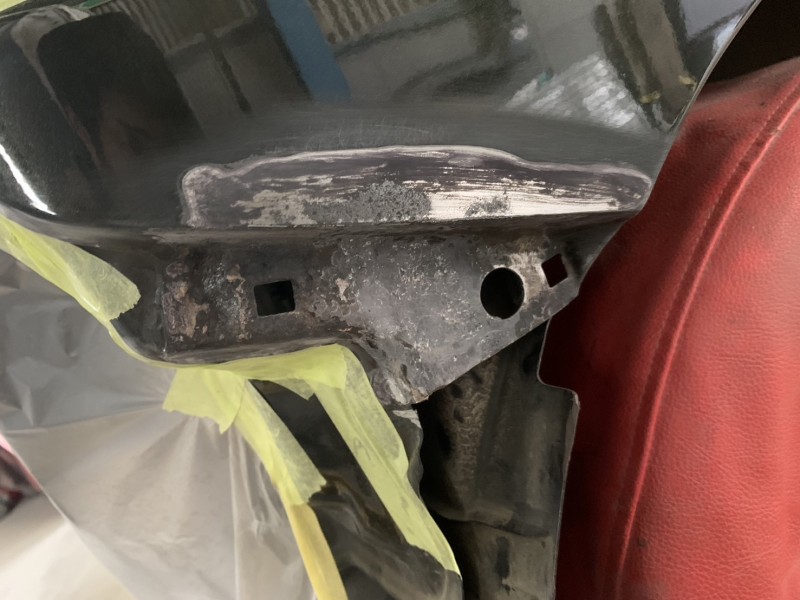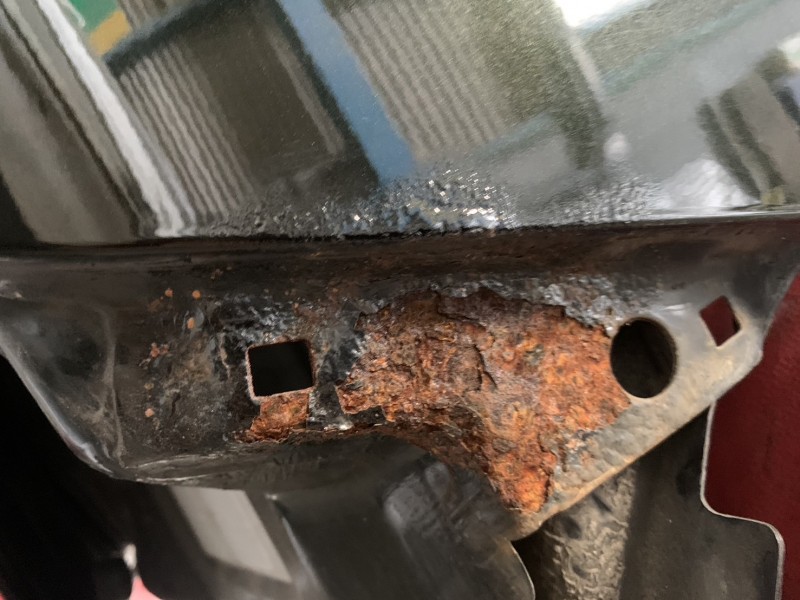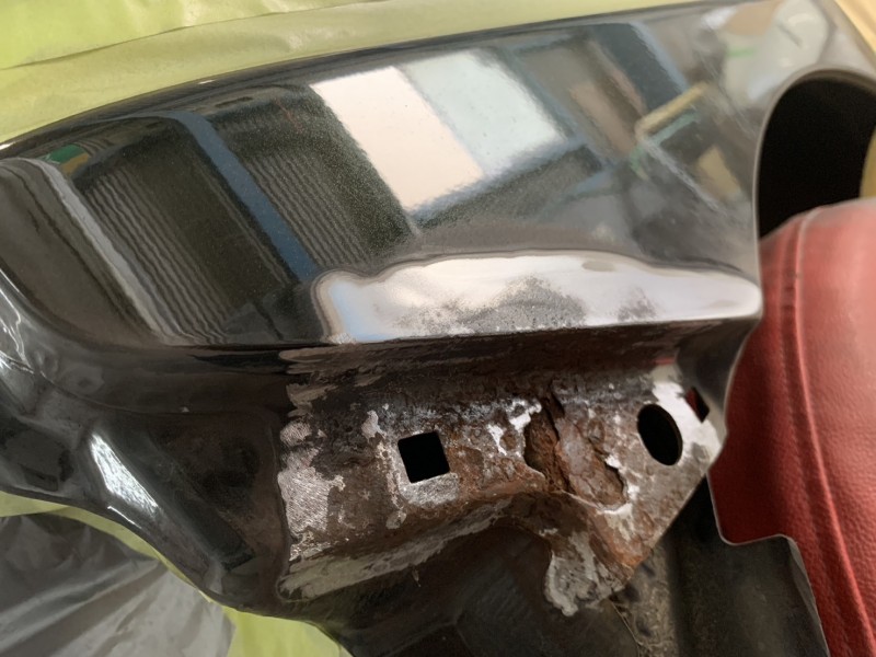 最初はクォータの表面の部分がちょっと錆びてるなーと思って、リヤバンパーを外してみたら、思いのほか錆がすごい状態になってました。(笑)