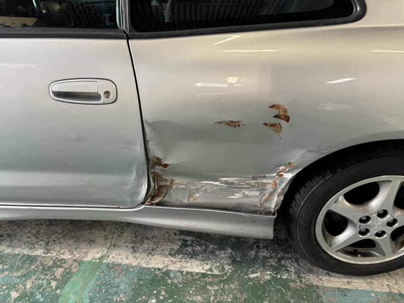 トヨタ セリカ 左側面修理 入庫 損傷部分アップ