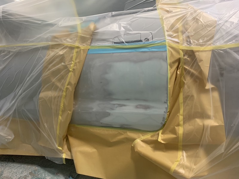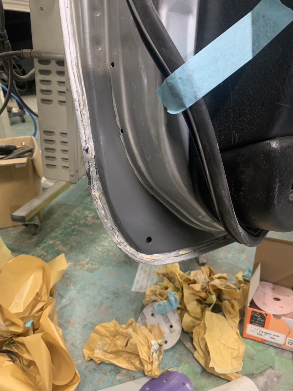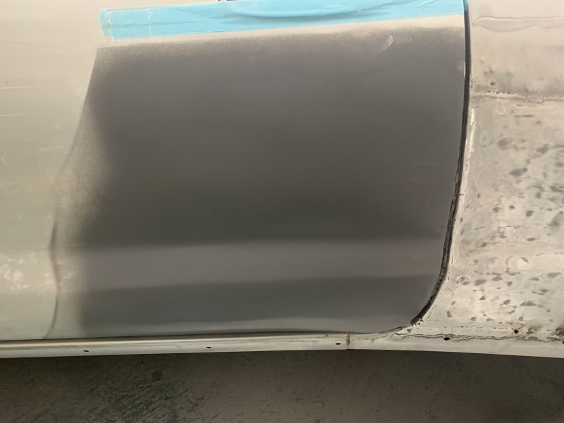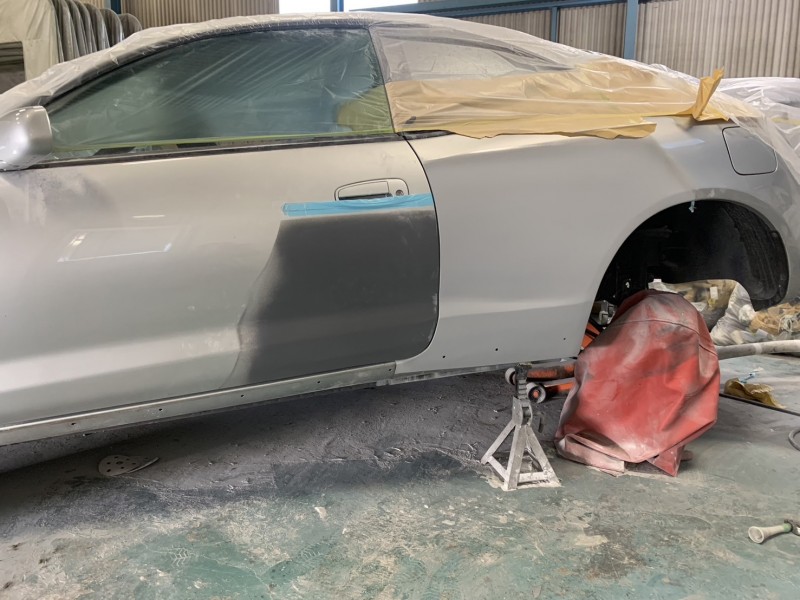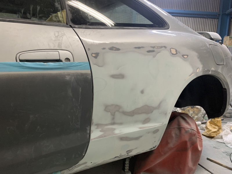 トヨタ セリカ 左側面修理 クォーターパネルパテ処理後、下地(サフェーサー)処理中