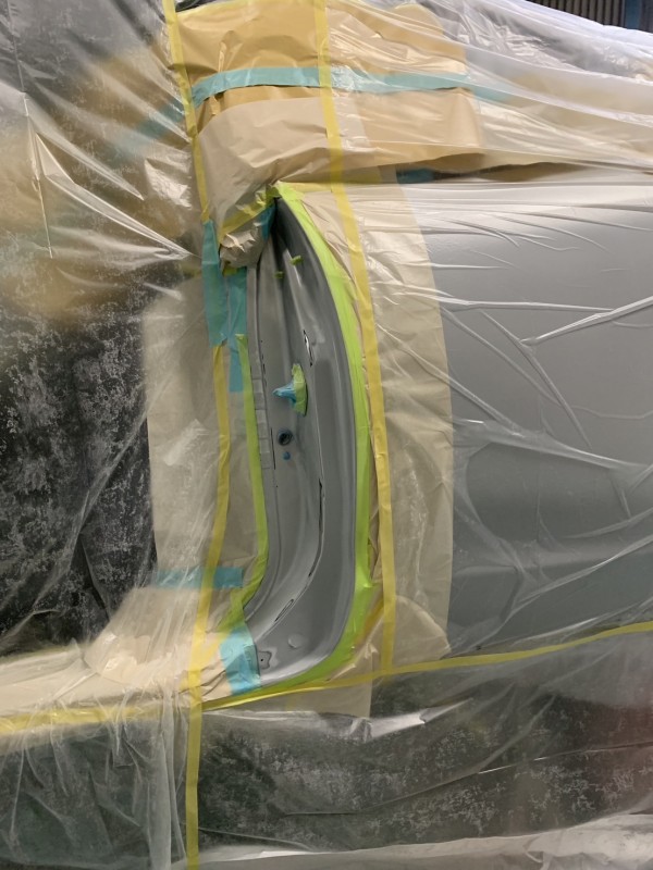 フロントドア&クォーターパネルの外板を同時に塗装するため、フロントドアを閉めたときに隠れるセンターピラーの部分を最初に塗装します。