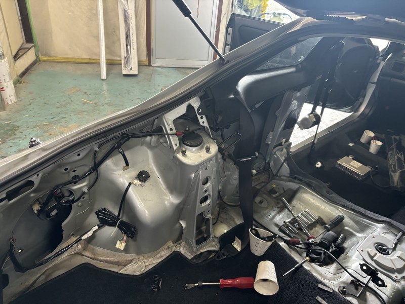 トヨタ セリカ 左側面修理 シート&クォーターパネル内張り剥がし(途中)