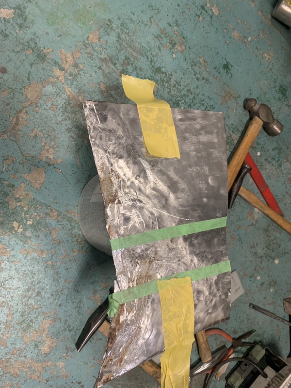 折れ曲がった鉄板を切除したら、あまりにも切り取ったサイズよりも小さくなって切り貼りする部分が多くなるので廃材の鉄板を形成して寸法を合わせて取付ける方法で施工する方法をとります。