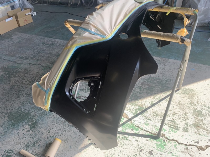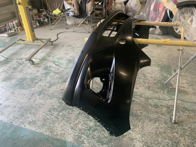 新品フロントバンパーはスタンドにかけて、脱脂すれば塗装待ちとなります。(^o^)
