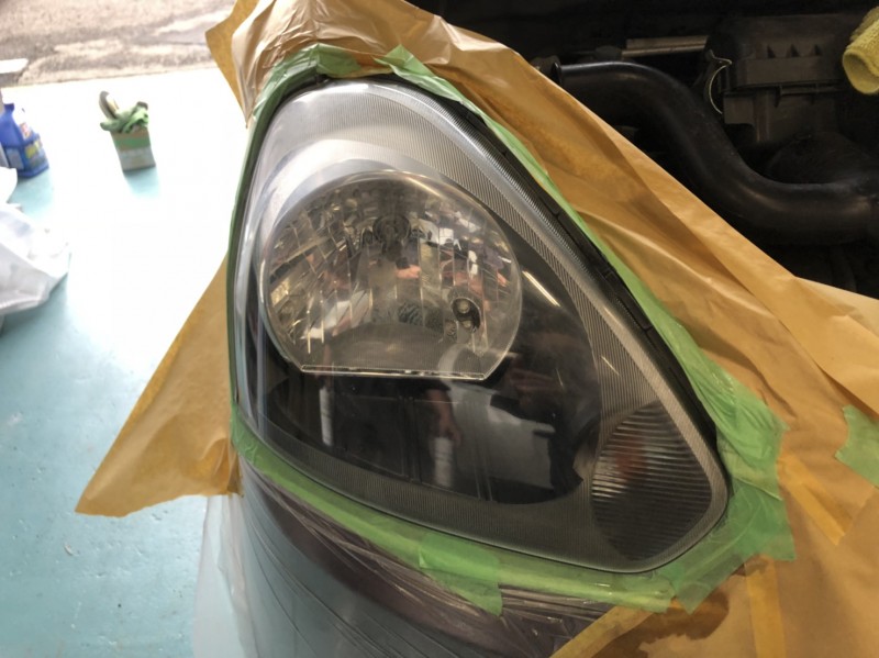 マスキングし、ヘッドライト磨き及びコーティング施工中(運転席側)