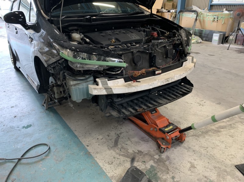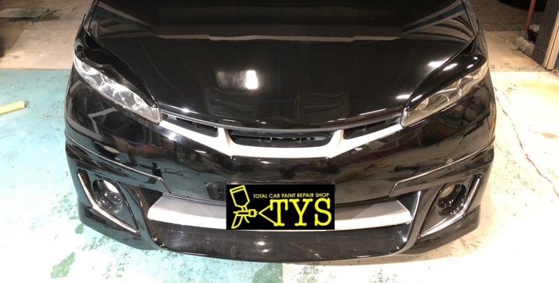 作業は連休前に一時納車した20ウィッシュが再入庫されたので、フロントフェンダー加工・フロントスポイラーの補修をしました。
