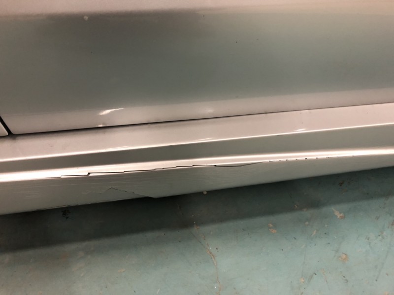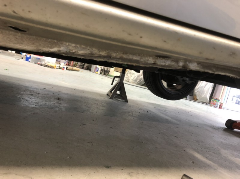 運転席下のロッカパネルも潰れて、地金が出ていたので鈑金、チッピングコート、部分塗装とマフラーがリアエアロに接触していたので、サービスでやらさせていただきました。