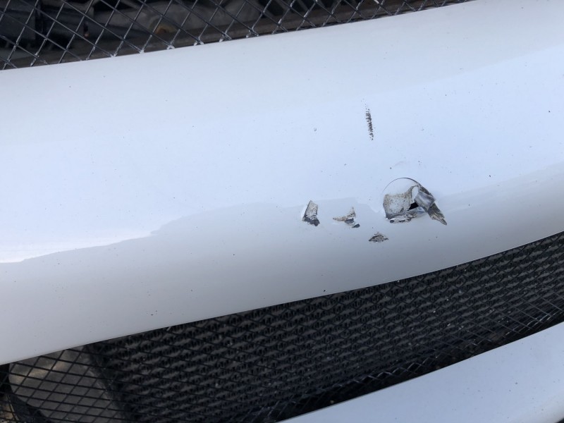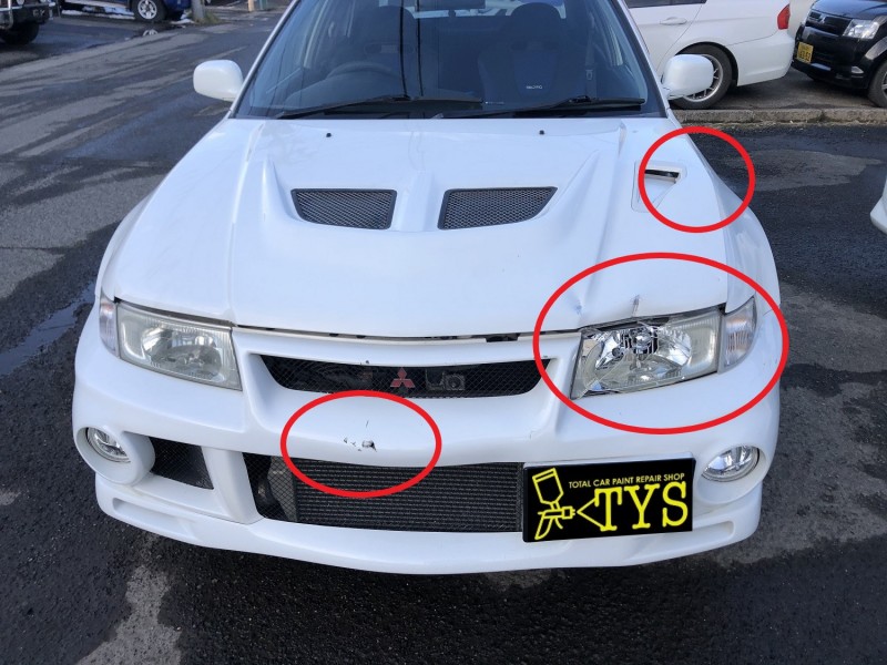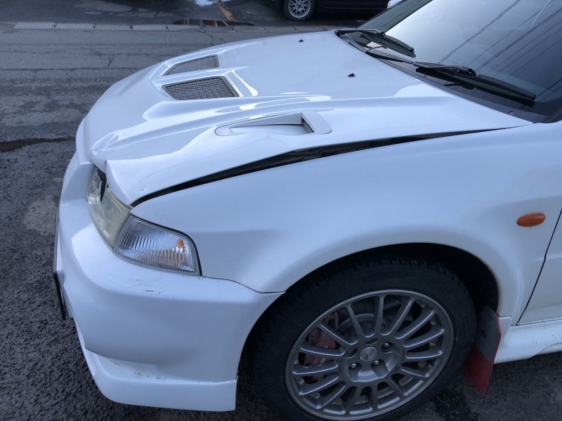 ランエボ ボンネットヘコミ、左ヘッドライト破損