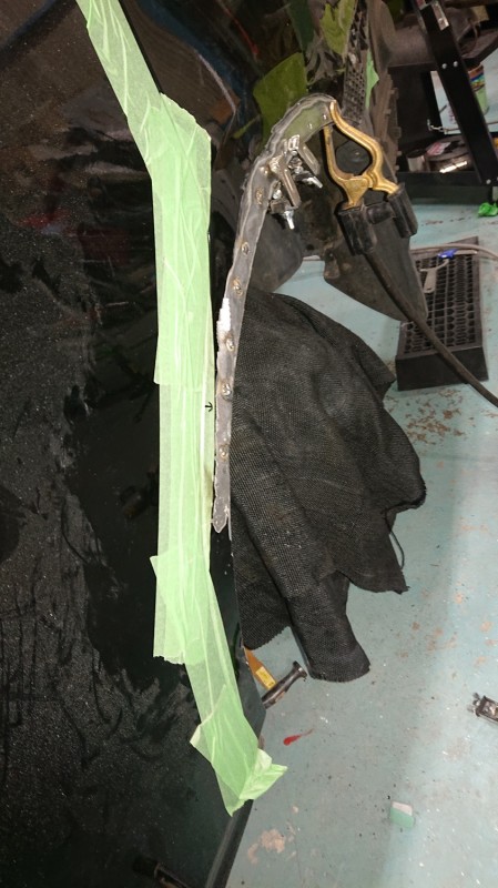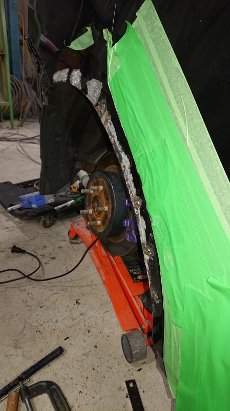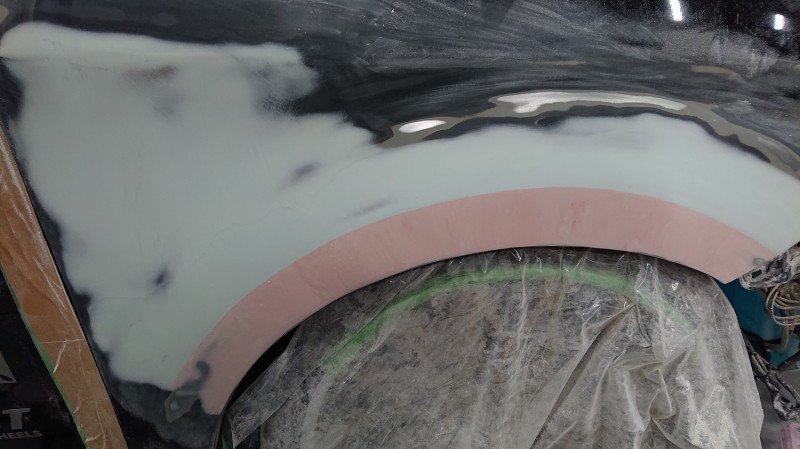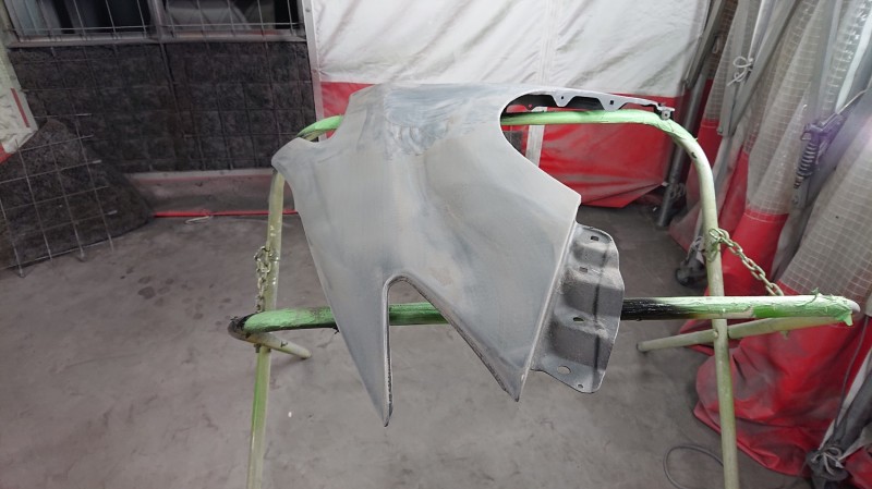 フロントフェンダーを叩き上げ、溶接にて補強しパテで形成していきます。