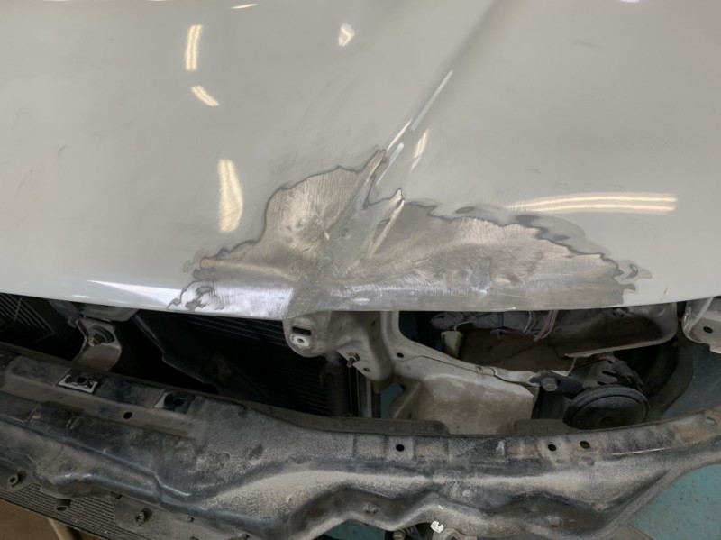 もう新品純正ボンネットが廃番で社外品も一時考えましたがオーナー様の意向により、なんとか板金していくような方向になりました。